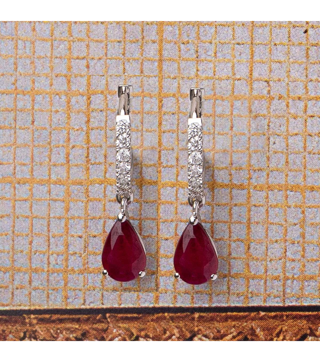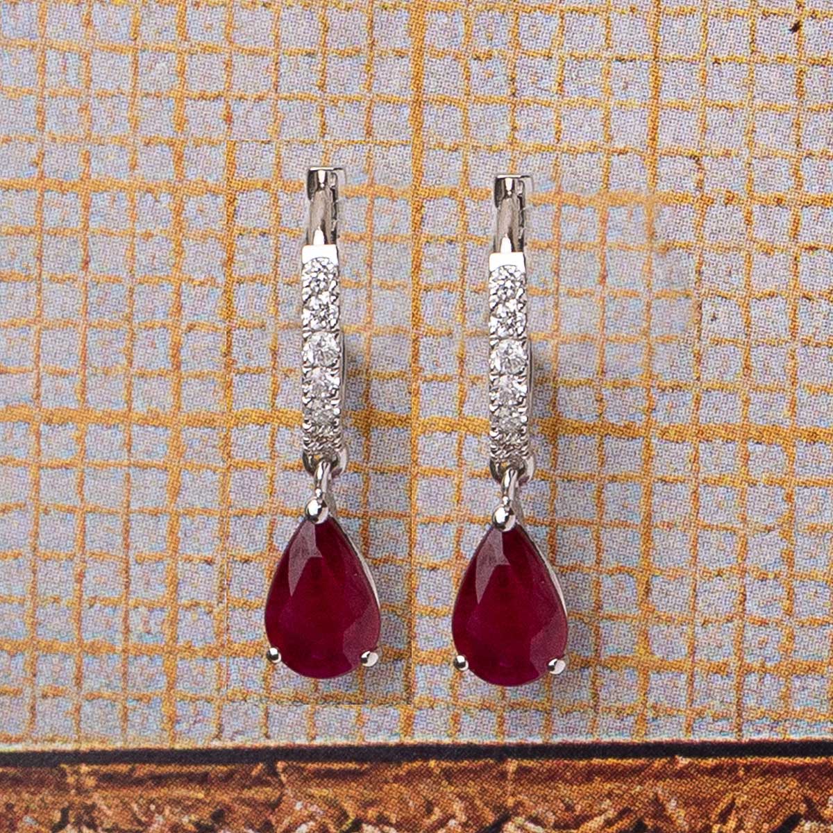 Pendientes "Olaya" de oro blanco de 18Kt compuesto por mini aro con diamantes talla brillante 0,10 Cts. y colgante de rubíes talla pera 1,02 Cts. Sofisticación en cada detalle.
