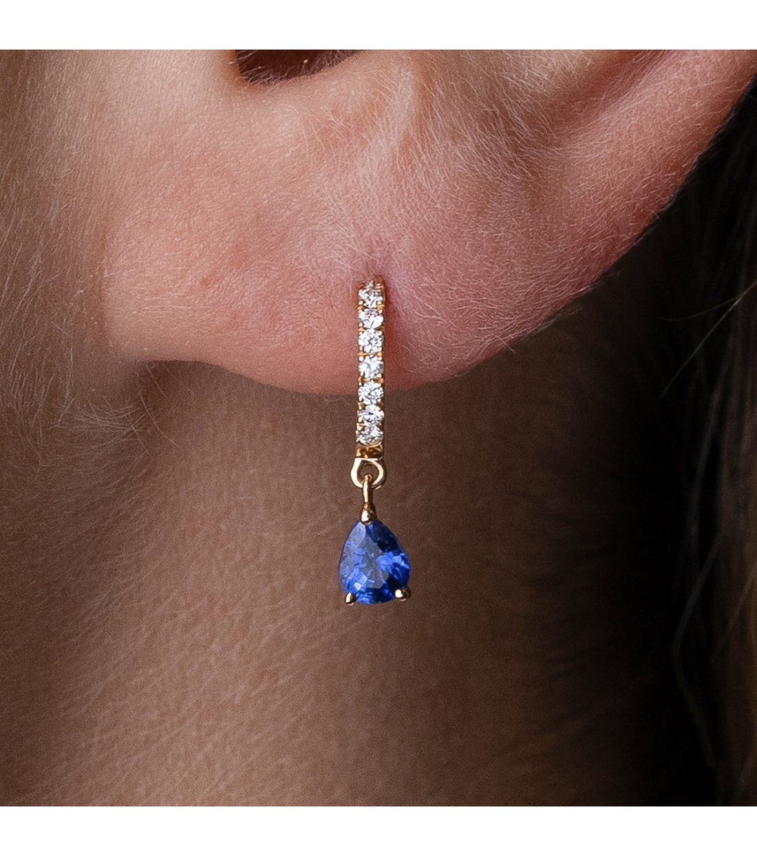 Pendientes "Olaya" de oro rosa de 1ª ley 18Kt compuesto por mini aro con diamantes talla brillante 0,10 Cts. y elemento colgante de zafiros talla pera 0,56 Cts. Diseñados para deslumbrar en cada ocasión.