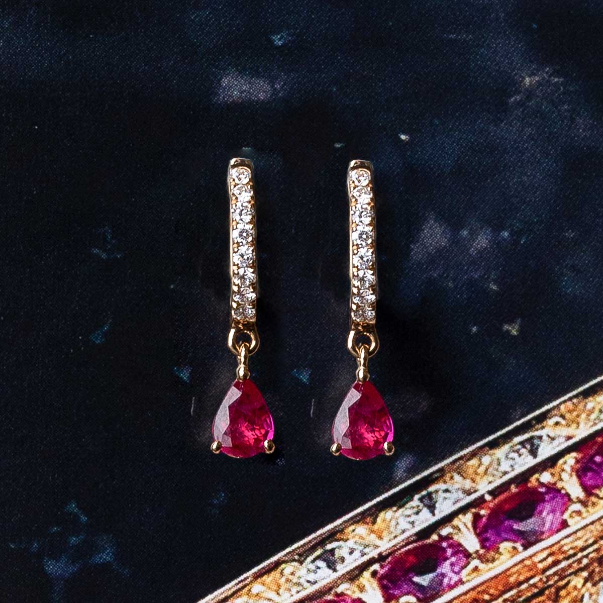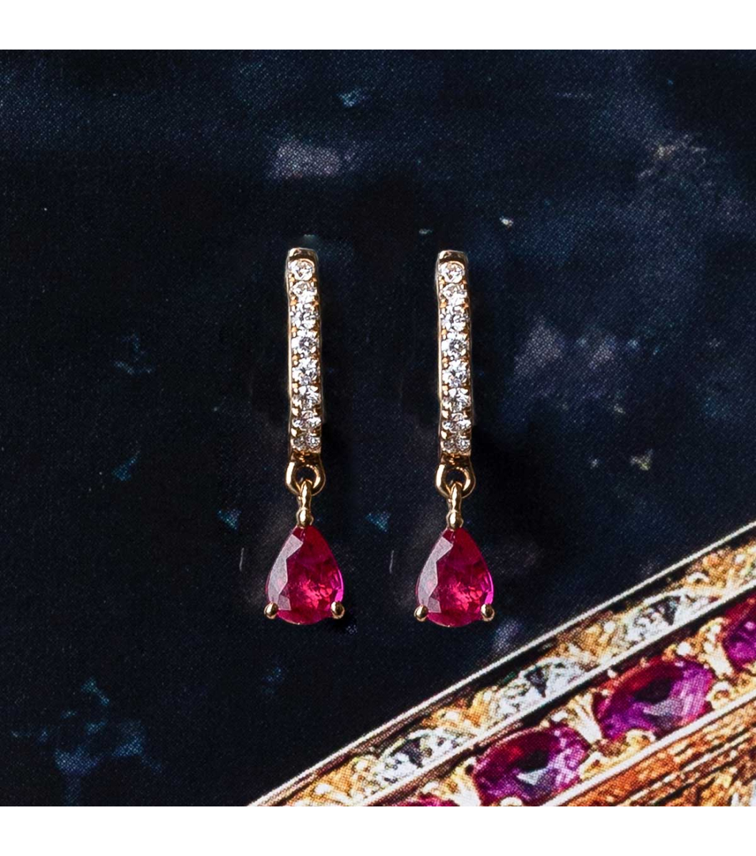 Pendientes "Olaya" de oro rosa de 1ª Ley de 18Kt compuesto por mini aro con diamantes talla brillante 0,10 Cts. y colgante de rubíes talla pera 0,38 Cts. Sofisticación en cada detalle.