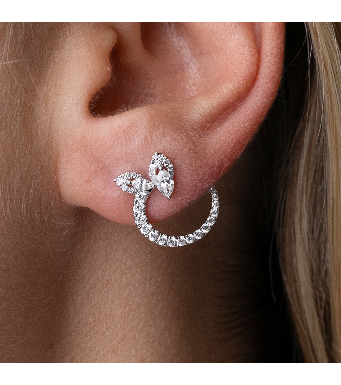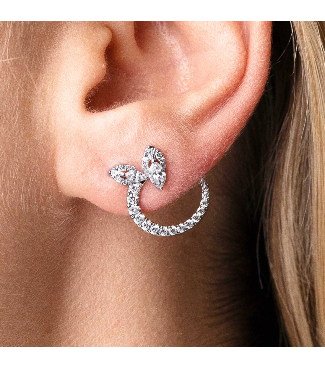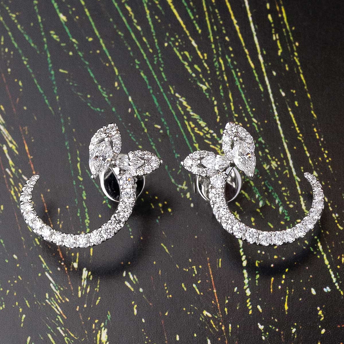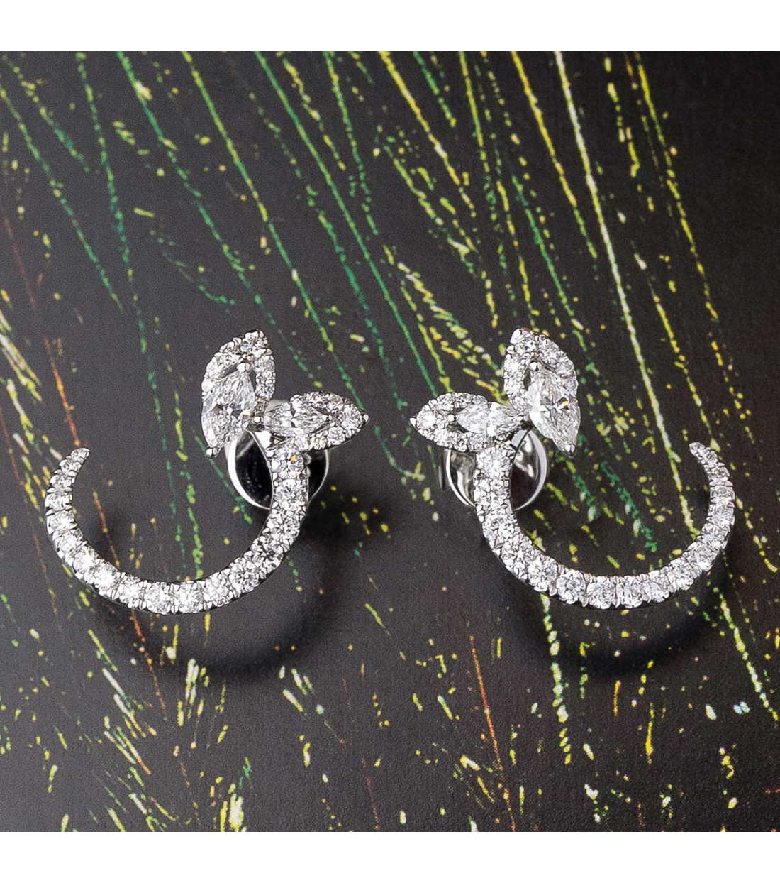 Pendientes "Indira" de oro blanco de 1ª Ley 18 K están diseñados para capturar la esencia del lujo contemporáneo. Su silueta curvada, engastada con diamantes talla brillante 0,53 y diamantes talla marquesa 0,32 cts.