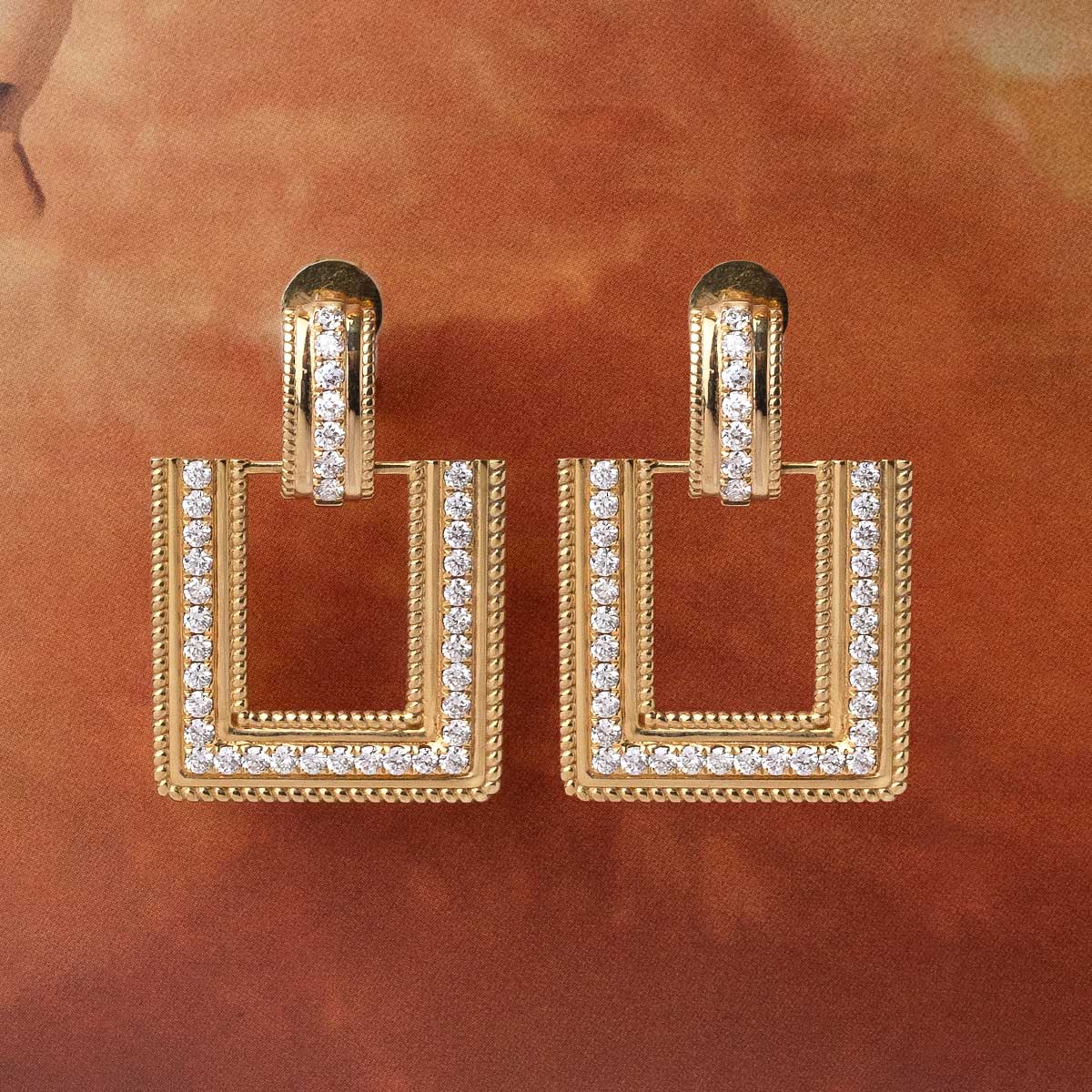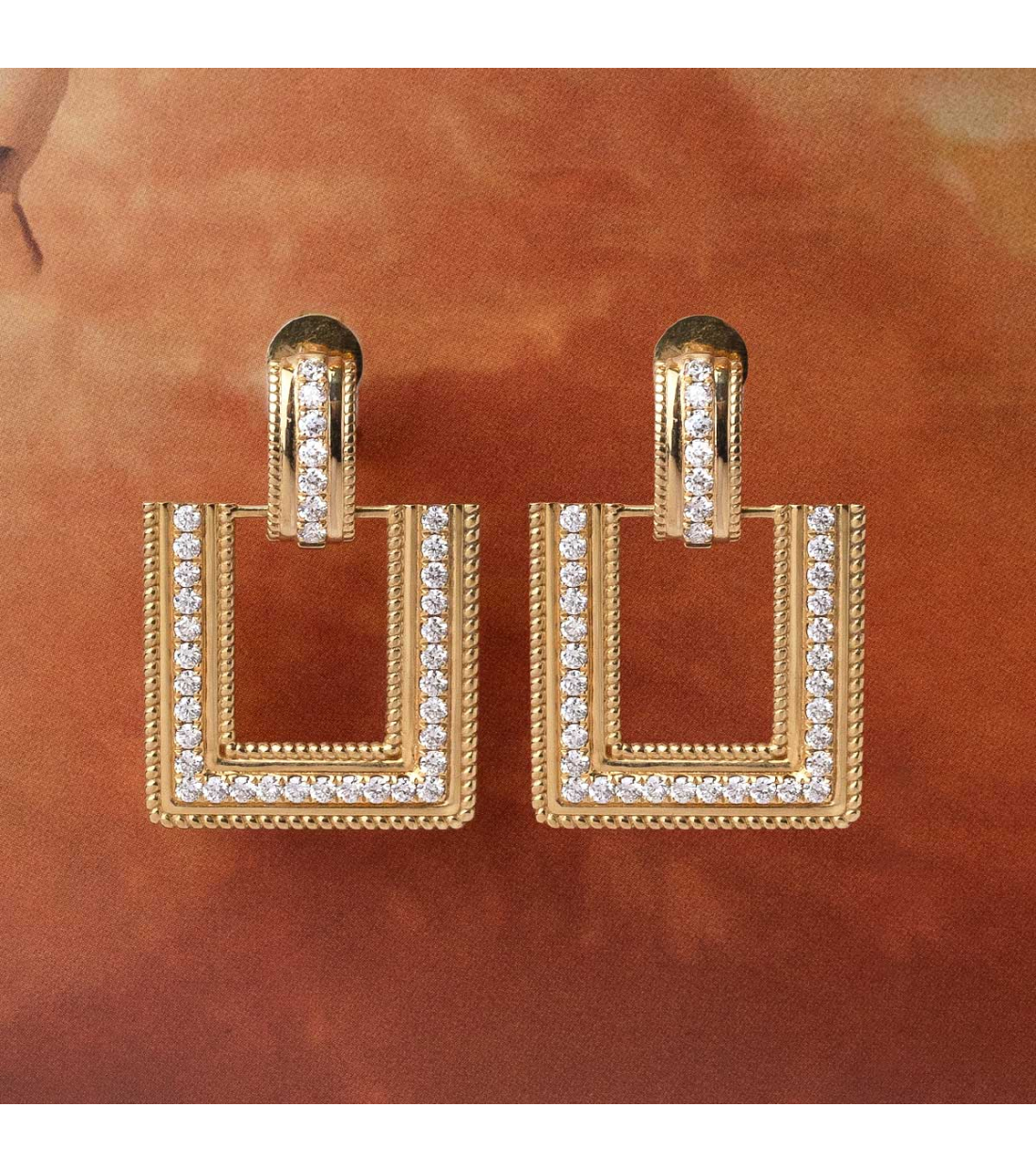 Pendientes largos "Cala" de oro amarillo de 1ª Ley de 18Kt. con diamantes talla brillante 1,28 cts. Aporta profundidad y una presencia escultural que se mueve con luz propia.