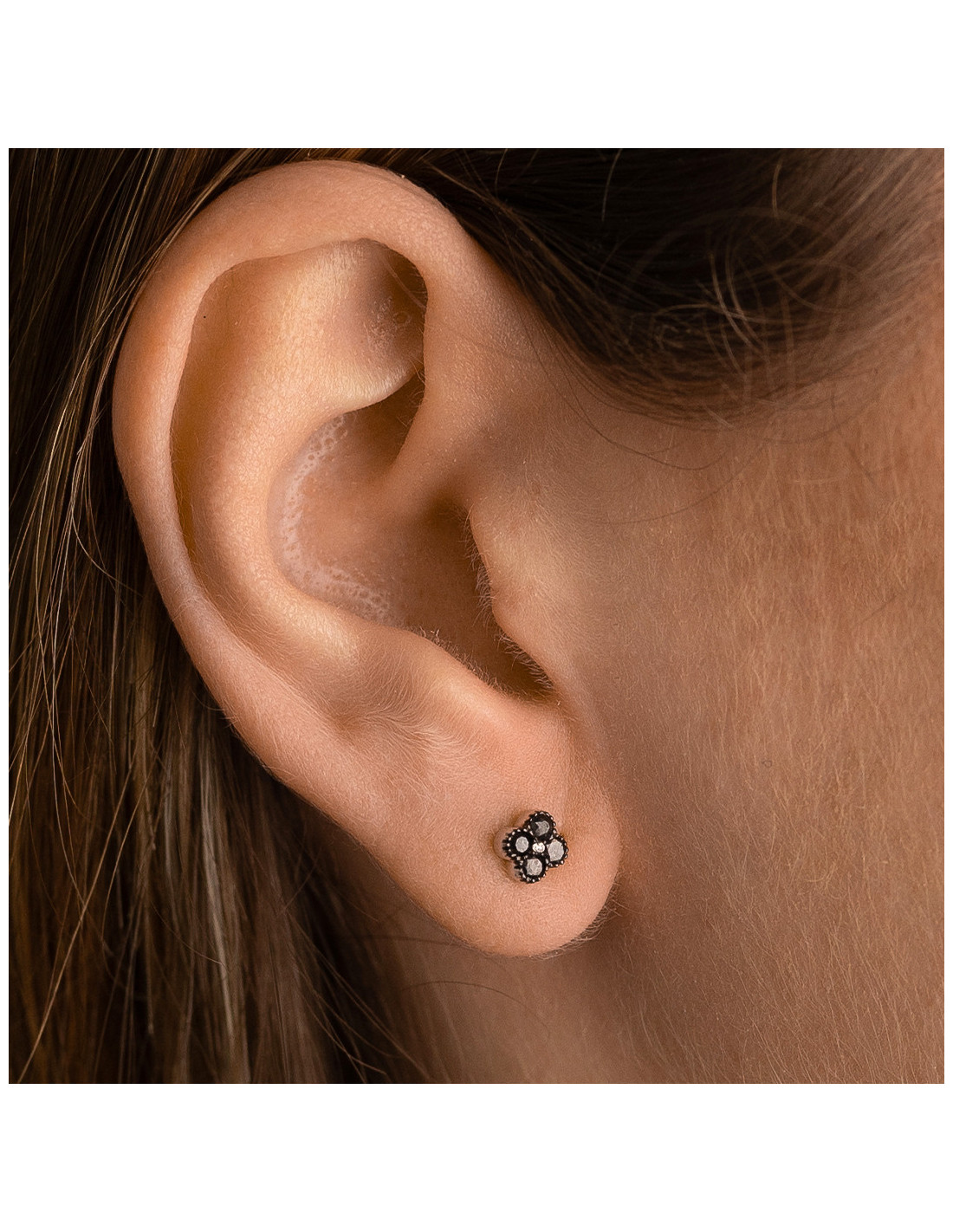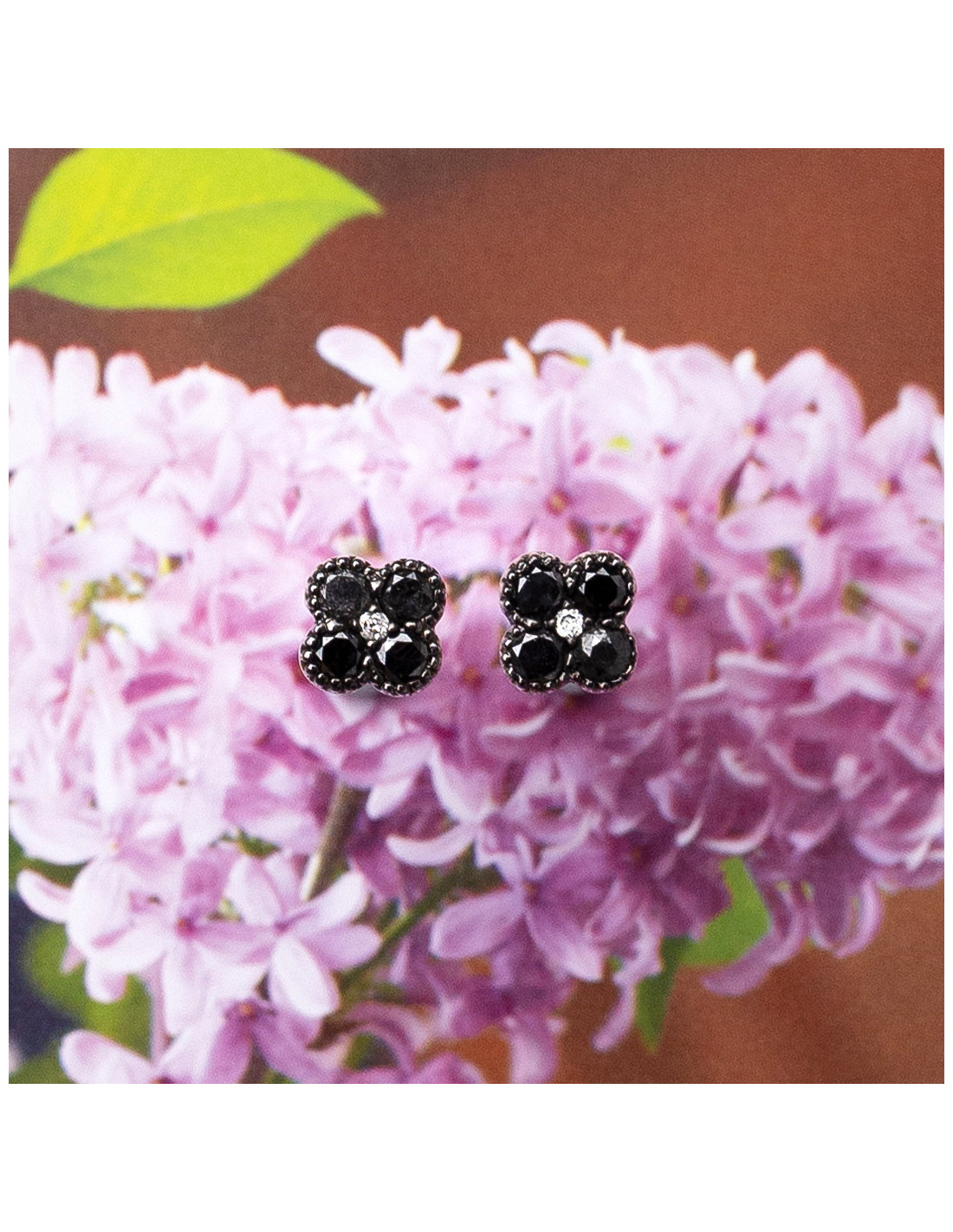 Pendientes "Flor" de oro blanco de 18 Kt., diamantes negros y diamante central en blanco. Perfectos para añadir un toque de distinción a tu look.