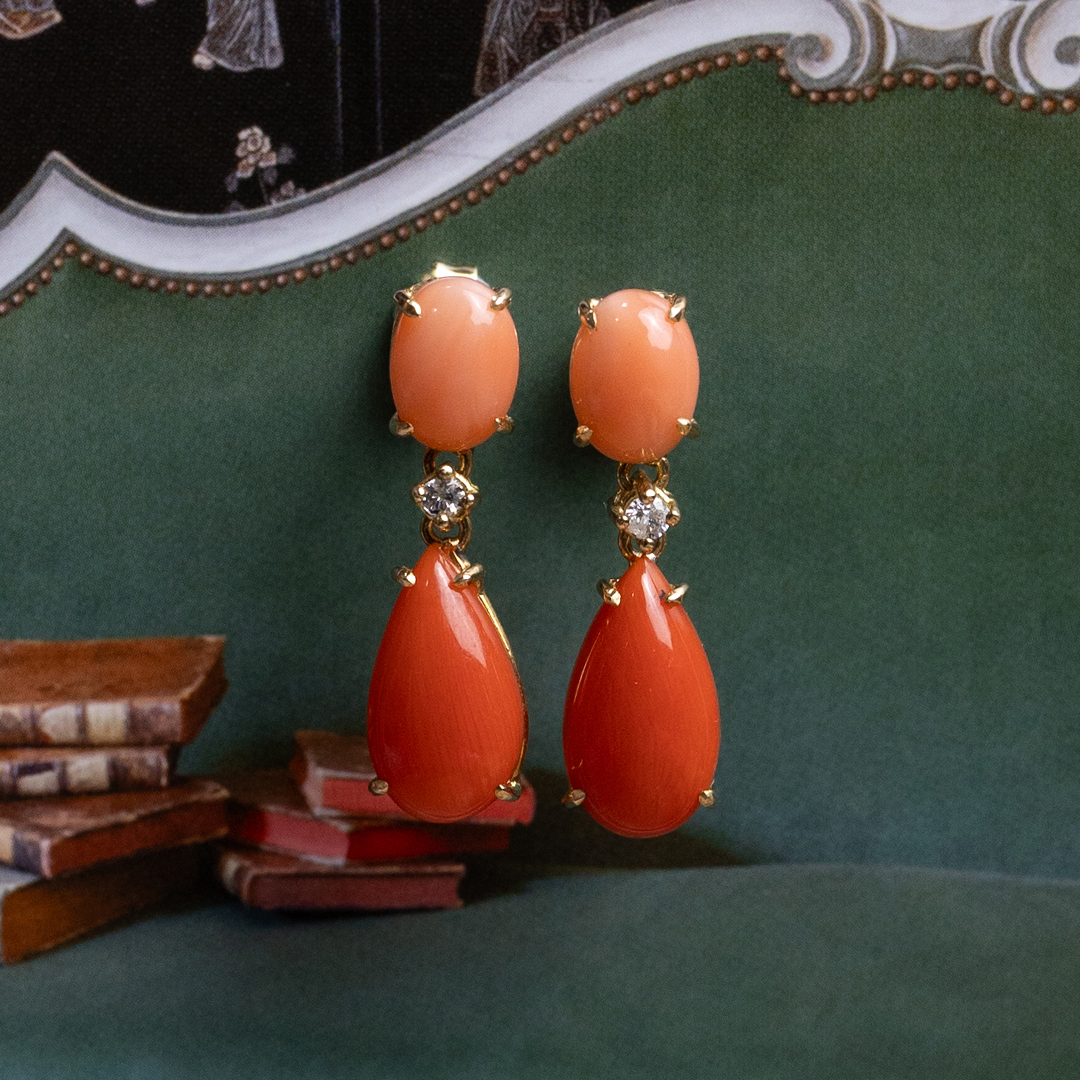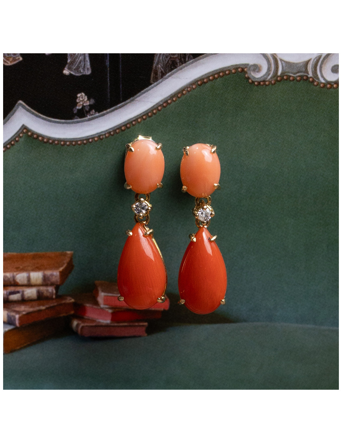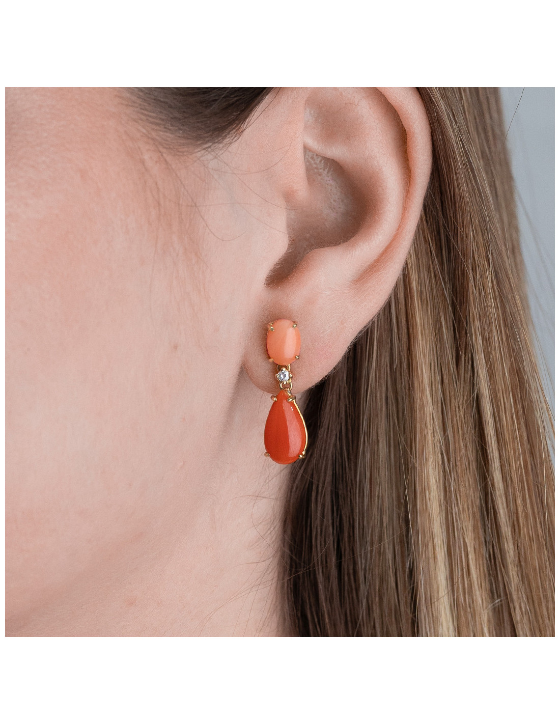 Pendientes "Carol" gota de coral con diamante y oro amarillo de 18Kt: Una sinfonía de elegancia y glamour.
