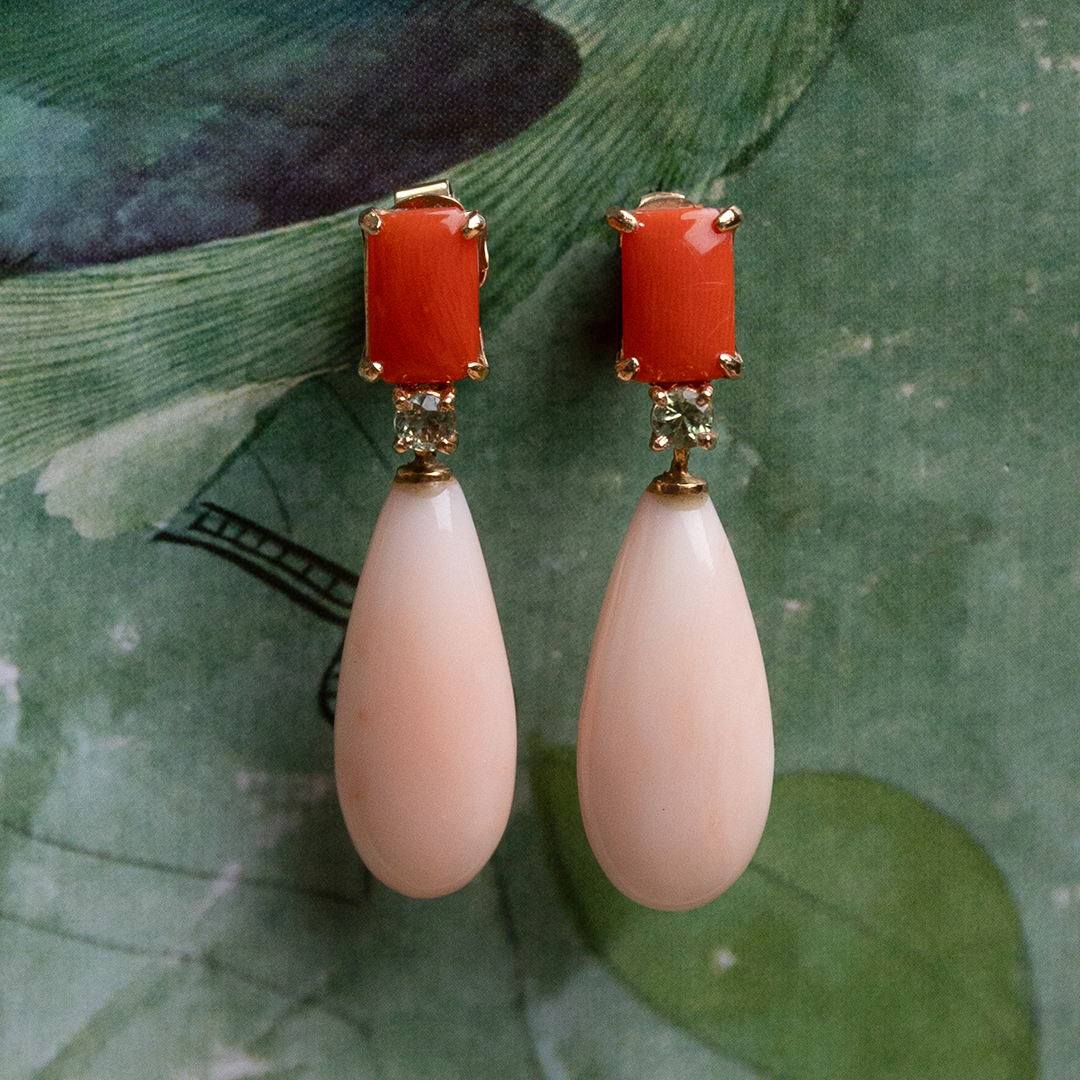 Pendientes "Carmela" gota de coral con zafiro y oro amarillo de 18Kt: Una sinfonía de elegancia para una entrada triunfal.