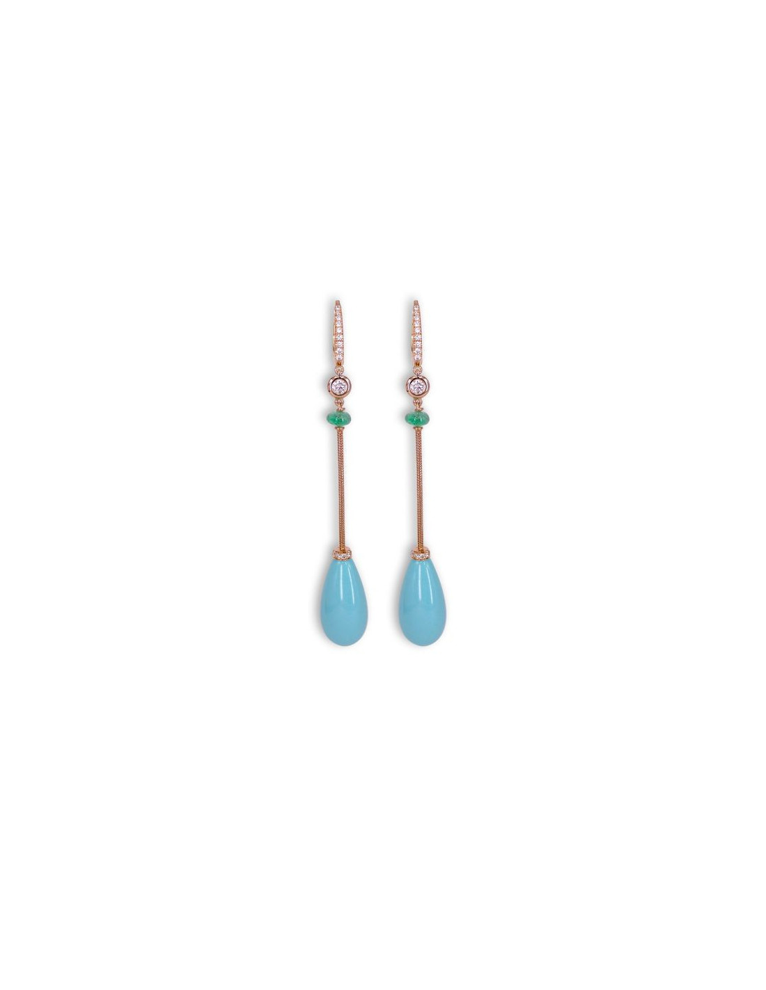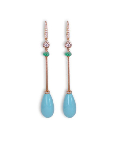 Pendientes largos "Alma" de oro rosa de 18Kt. con turquesas, esmeraldas y diamantes. Un toque de glamour para tu entrada triunfal.