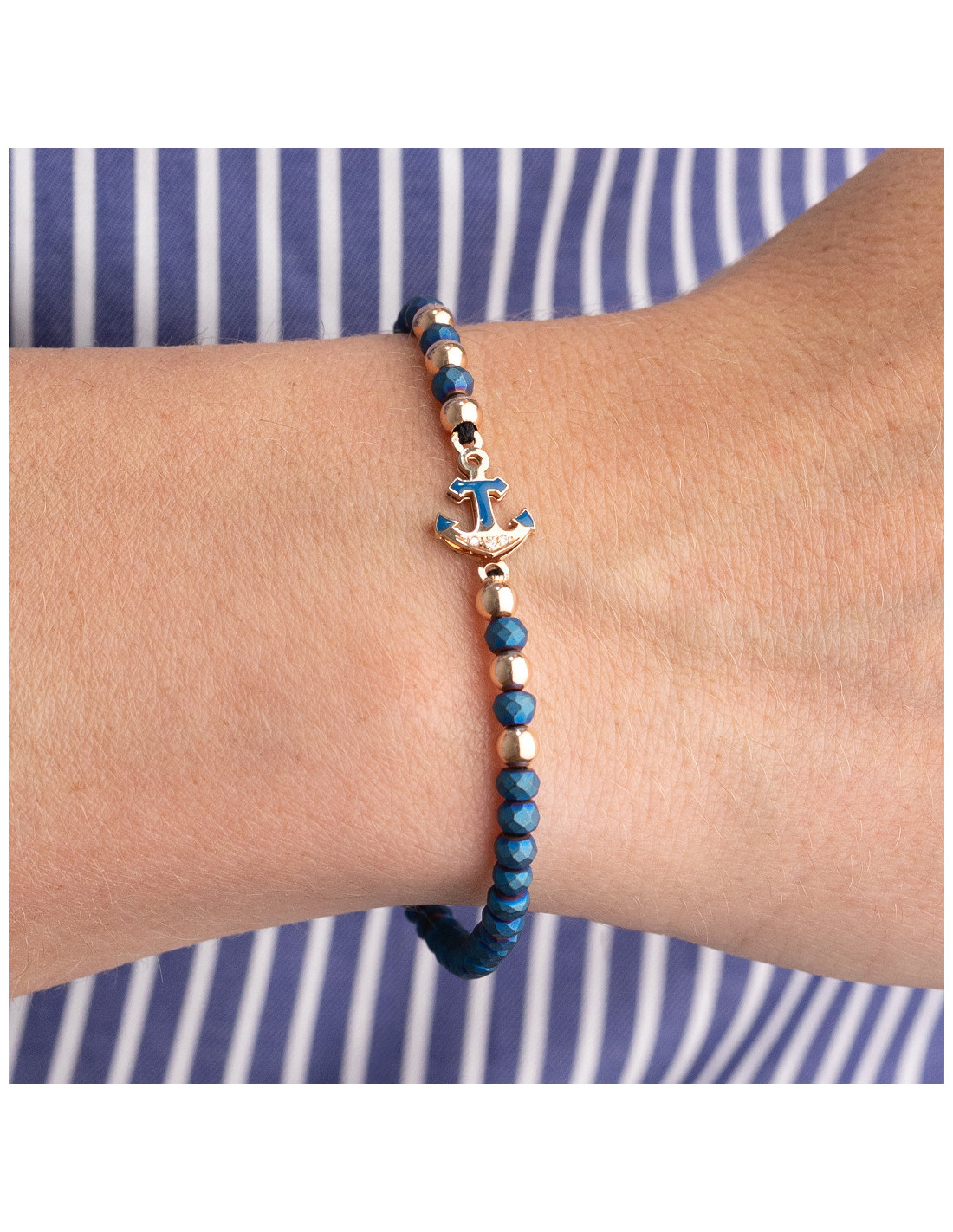 Un Tesoro Marino de Elegancia y Brillantez. La pulsera "Océano" de hilo color negro con nudos de macramé, cuentas de oro rosa de 18kt., hematites azules y diamantes.