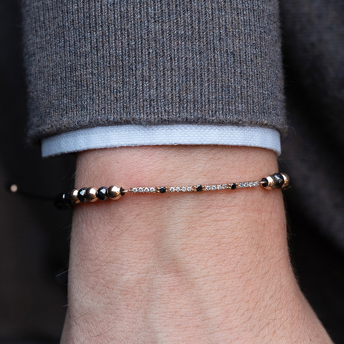 Pulsera "Alfredo" de hilo negro con dijes en oro rosa de 18Kt, hematites y diamantes negros. Versatilidad para cualquier ocasión.