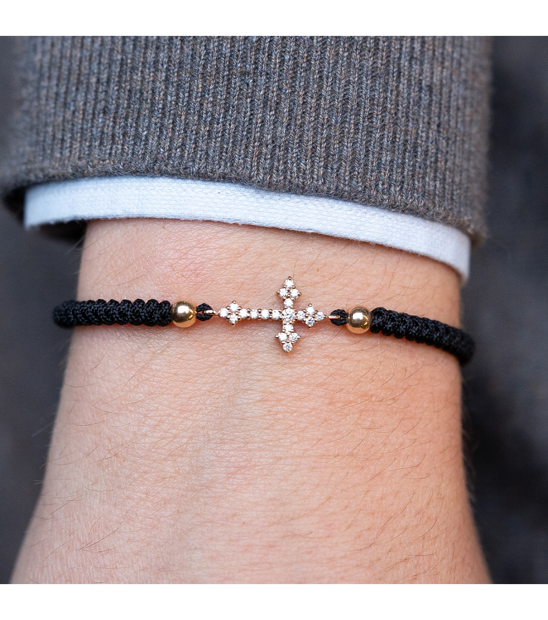 Pulsera "Peter" de hilo de macramé con cruz como elemento central de oro rosa de 18Kt y diamantes. Es un símbolo de fe y estilo.