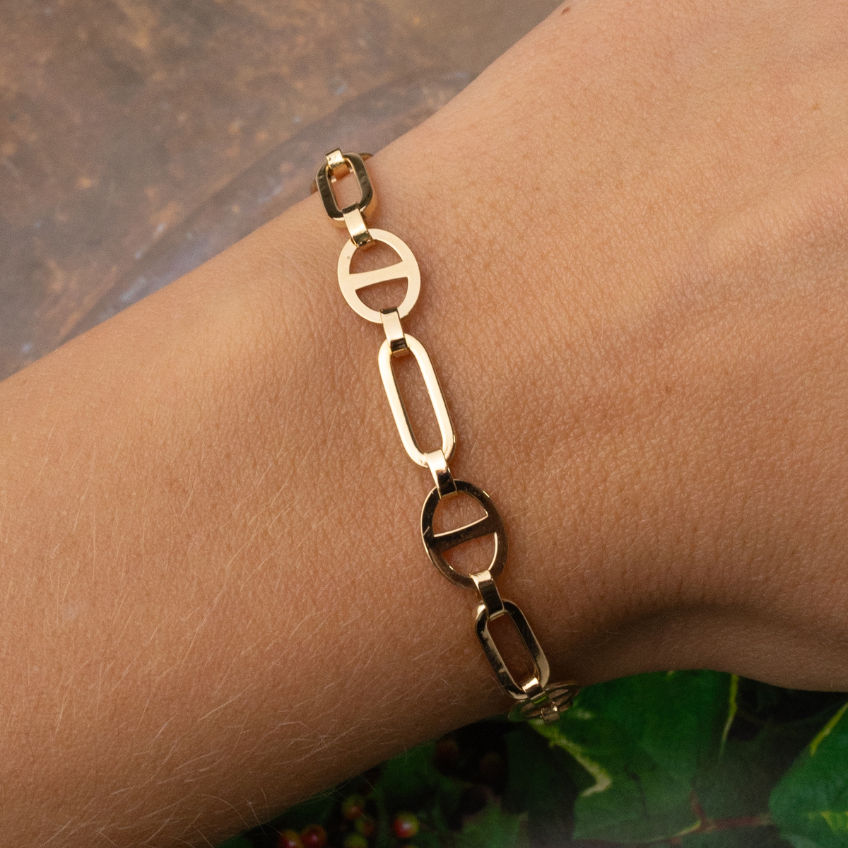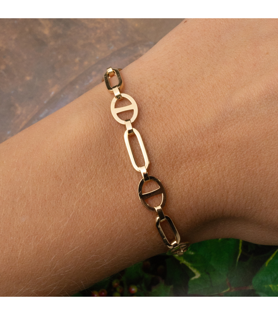 Pulsera "Serena" eslabón ovalado plano de oro amarillo y cadena de eslabones marina plana. Un diseño atemporal y versátil para cualquier ocasión.