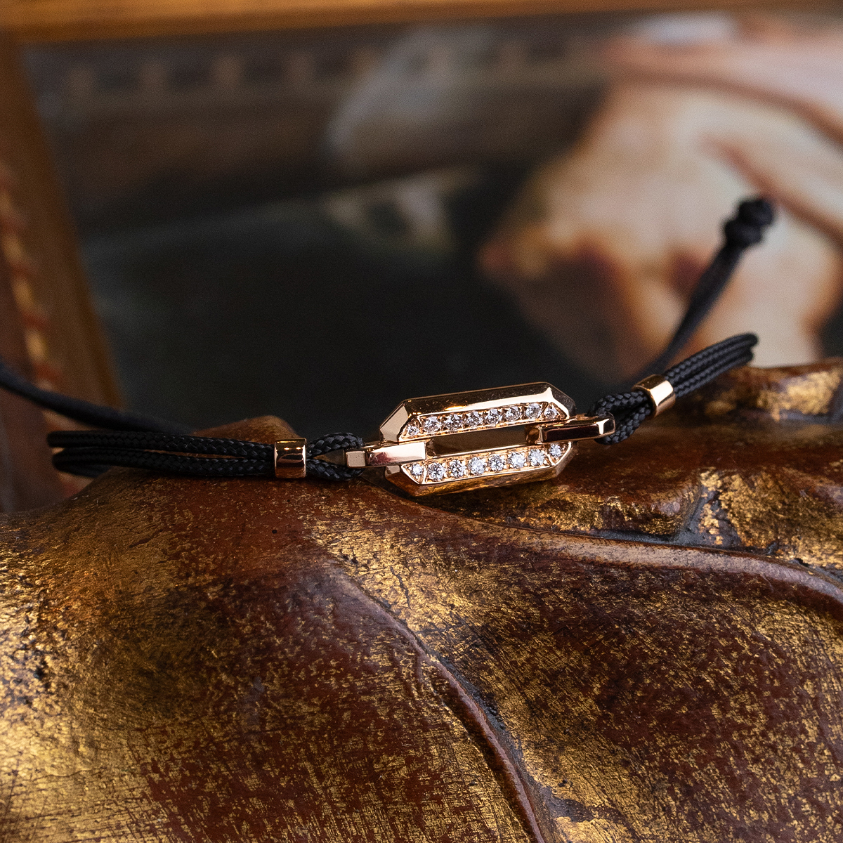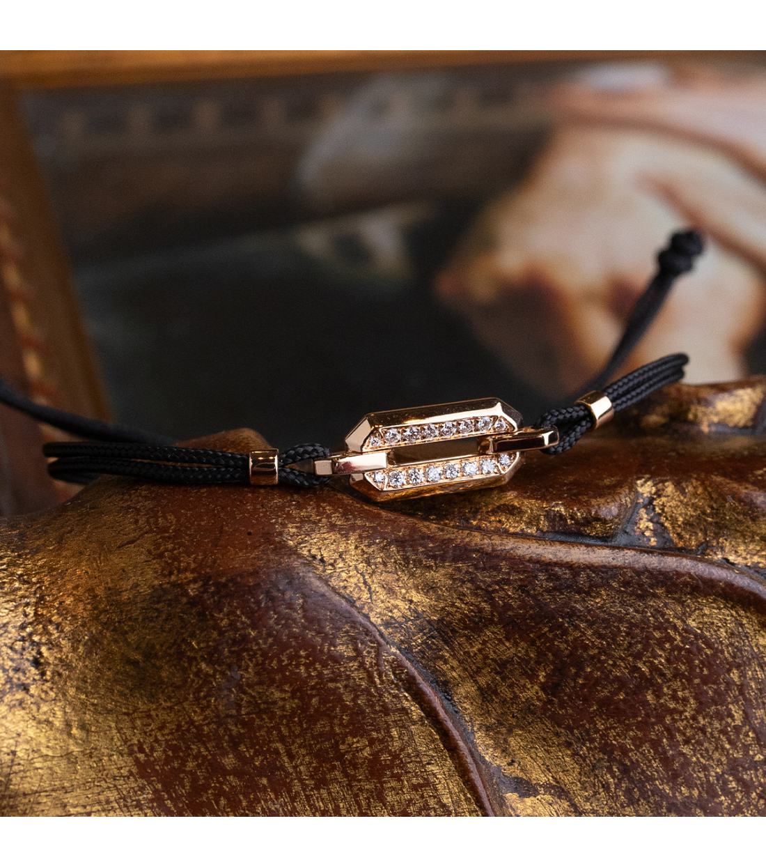 Pulsera de hilo de macramé "Jora" con elemento en oro rosa de 18Kt con diamantes talla brillante 0,15Cts. Perfecta para un estilo de vida dinámico.