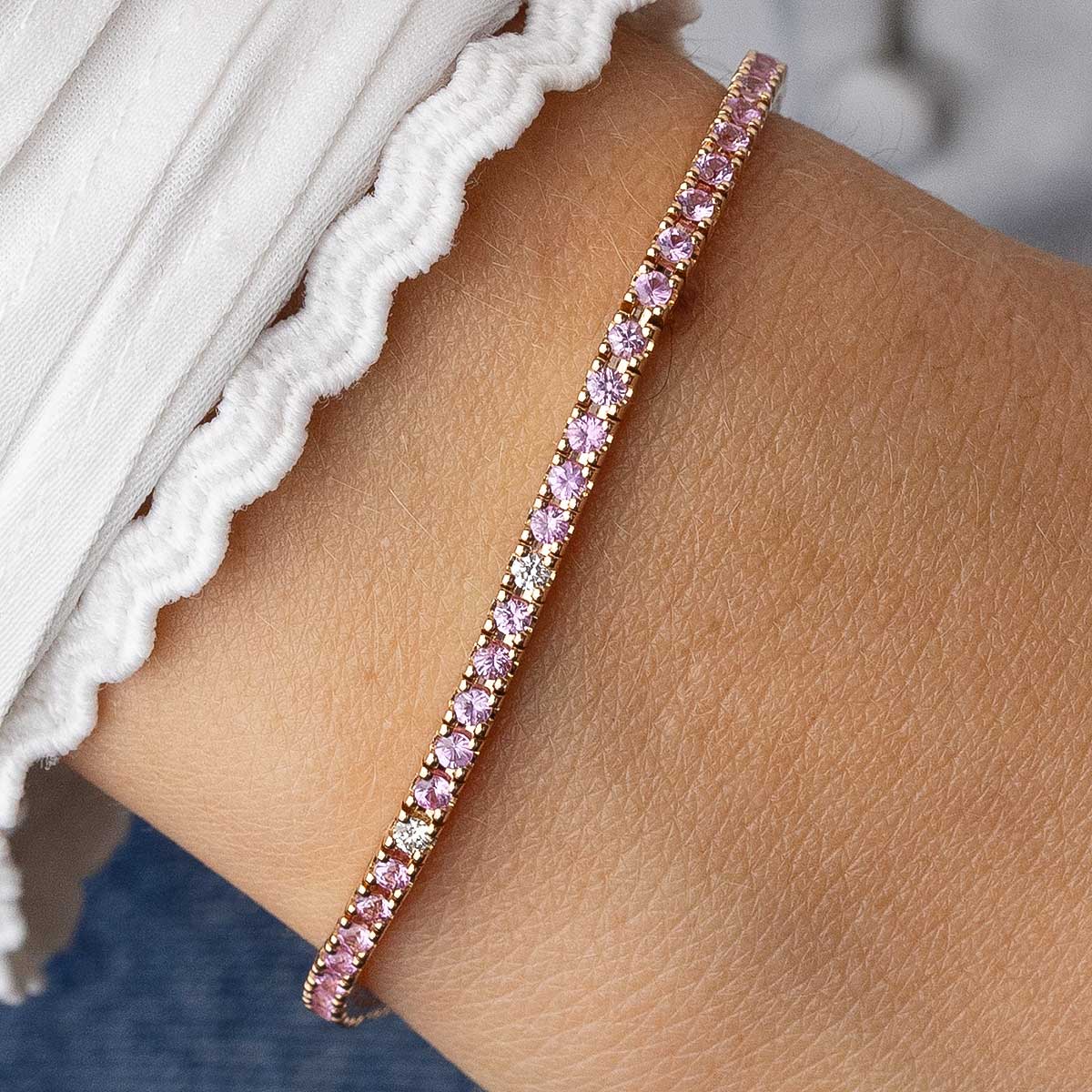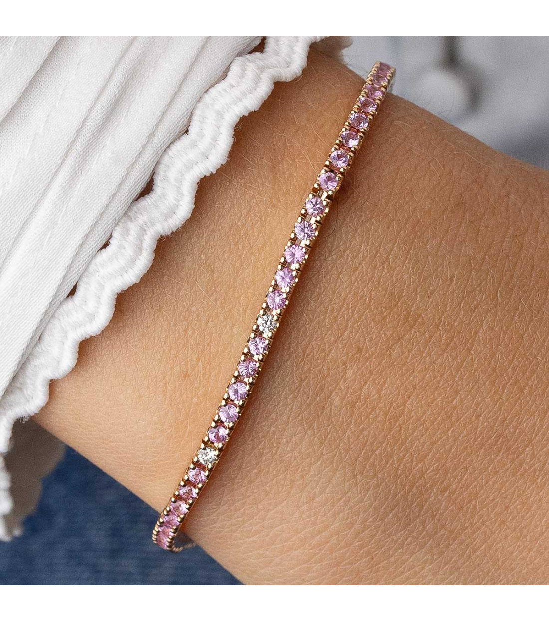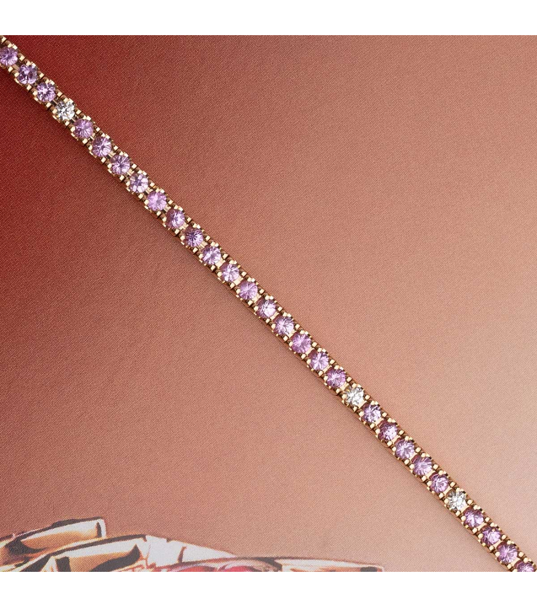 Pulsera rivére "Avery" de oro rosa de 1ª Ley de 18Kt. con diamantes talla brillante 0,15 Cts. y zafiros rosa talla brillante 2,25 Cts. Femenino y sofisticado.