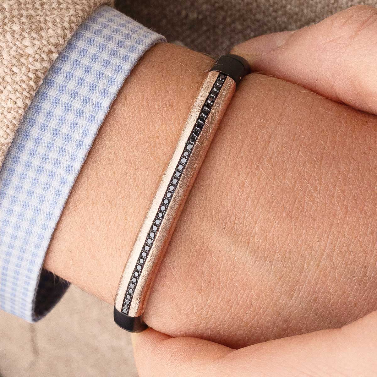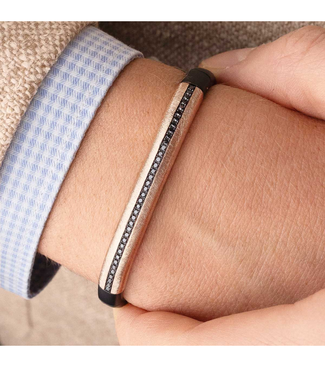 Pulsera de hombre "Thiago" de oro rosa de 1ª Ley de 18Kt y cerámica, con diamantes negros talla brillante 0,33 cts. Un toque de carácter y lujo sutil, elevando la estética de la joya con un brillo profundo e irresistible.