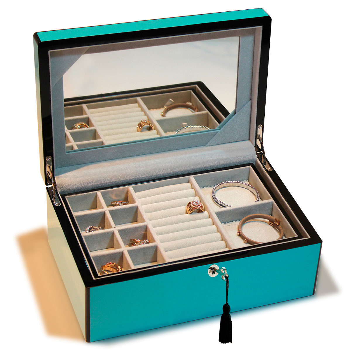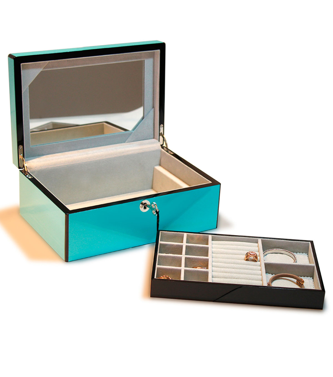 Joyero Turquesa lacado en ultra brillo con doble departamento y espejo frontal. Cierre de seguridad con llave. Su diseño sofisticado y acabados de lujo resguardarán tus joyas con delicadeza.