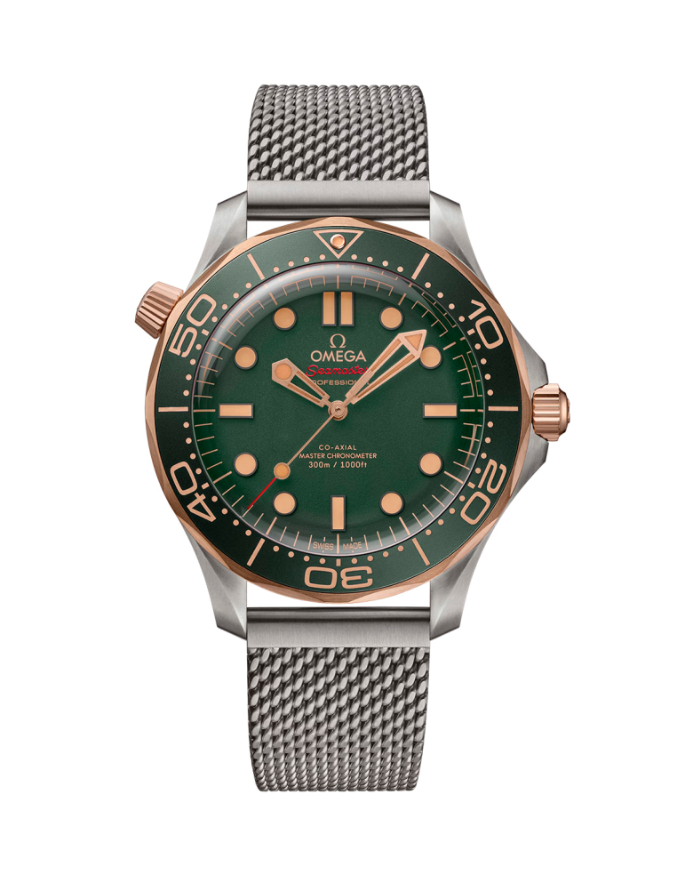 Este modelo de 42 mm está realizado en titanio de grado 2 y en el exclusivo Oro Bronce de 9 qt de OMEGA. Posee un aro de bisel verde de aluminio anodizado oxálico con una escala de inmersión en Super-LumiNova de época.