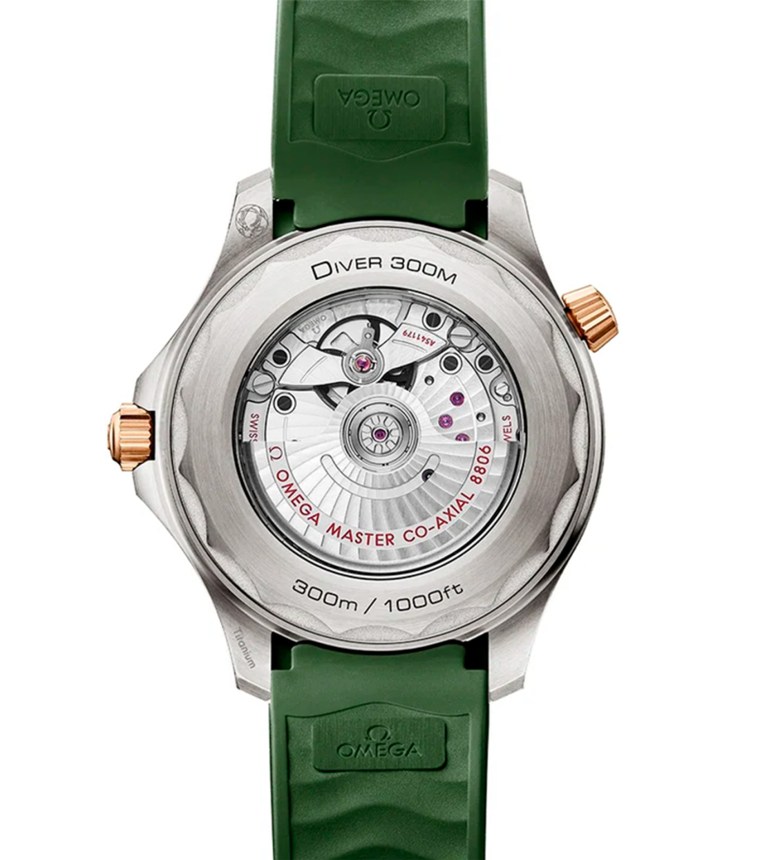 El reloj se presenta con una pulsera de caucho verde integrada con cierre desplegable y está equipado con el movimiento OMEGA Co-Axial Master Chronometer calibre 8806, visible a través del cristal de zafiro del fondo de caja.