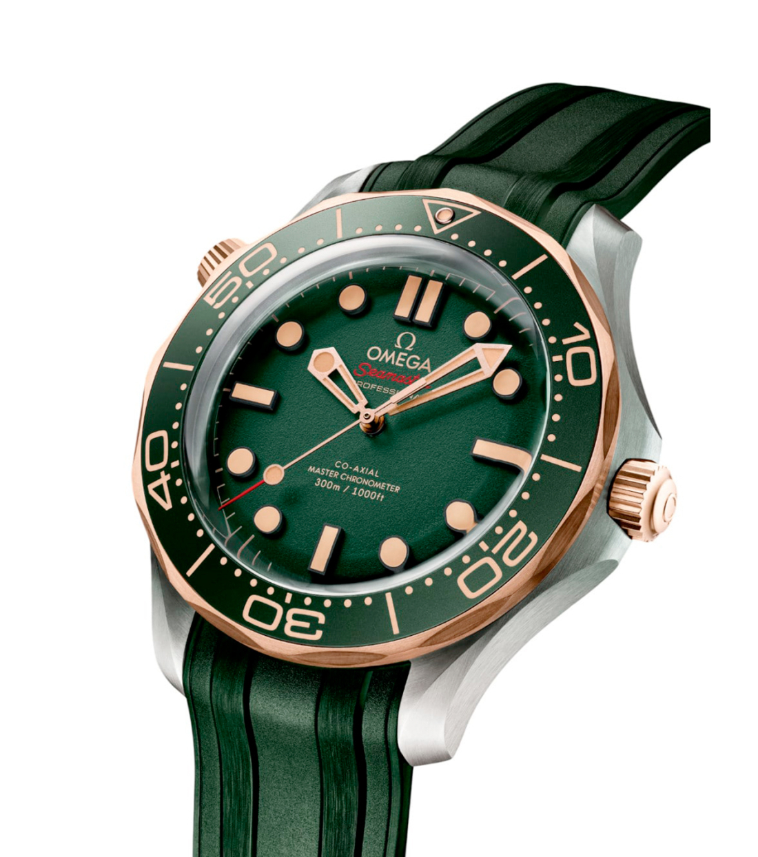 Este modelo de 42 mm está realizado en titanio de grado 2 y en el exclusivo Oro Bronce de 9 qt de OMEGA. Posee un aro de bisel verde de aluminio anodizado oxálico con una escala de inmersión en Super-LumiNova de época.