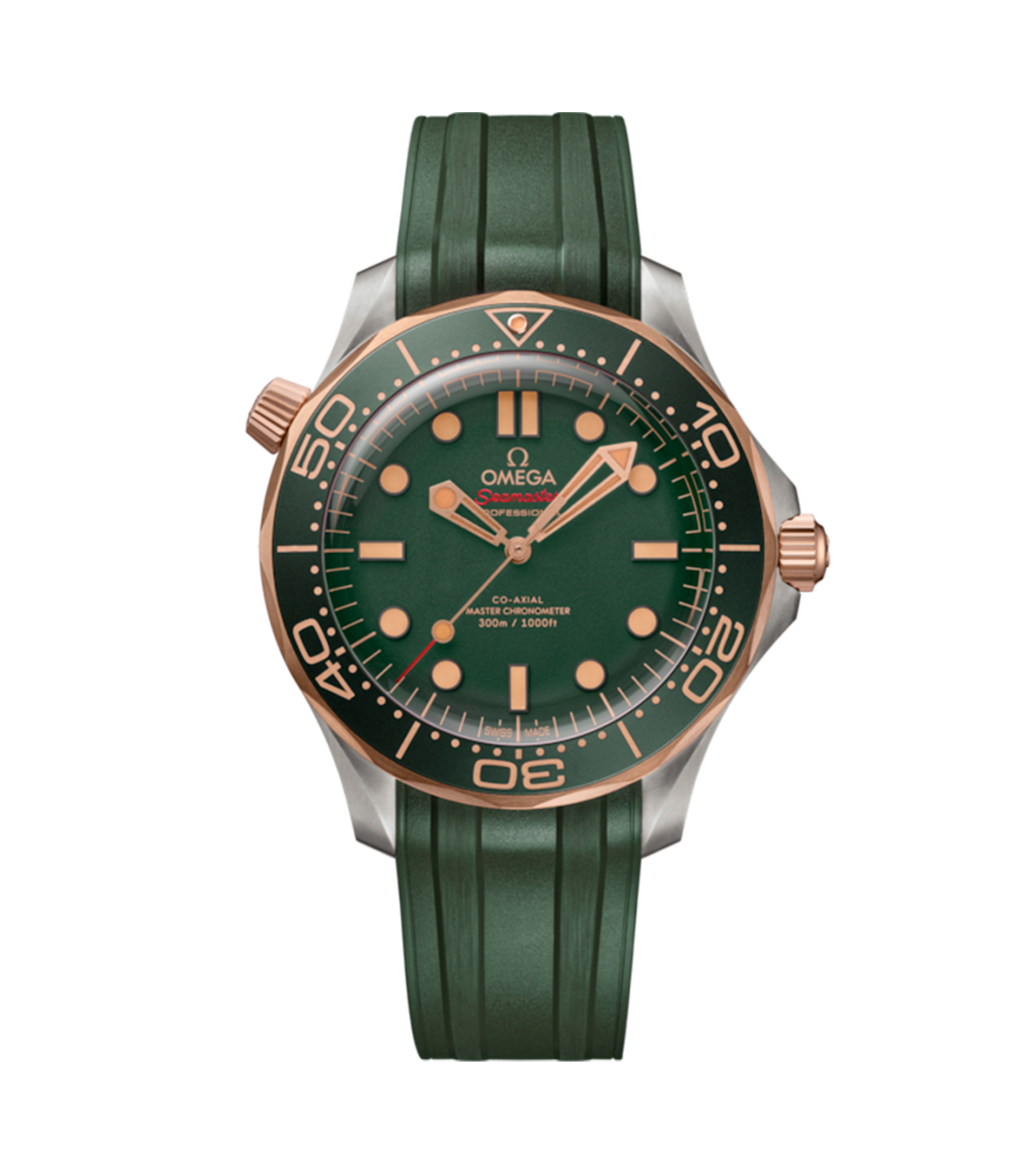 Este modelo de 42 mm está realizado en titanio de grado 2 y en el exclusivo Oro Bronce de 9 qt de OMEGA. Posee un aro de bisel verde de aluminio anodizado oxálico con una escala de inmersión en Super-LumiNova de época.