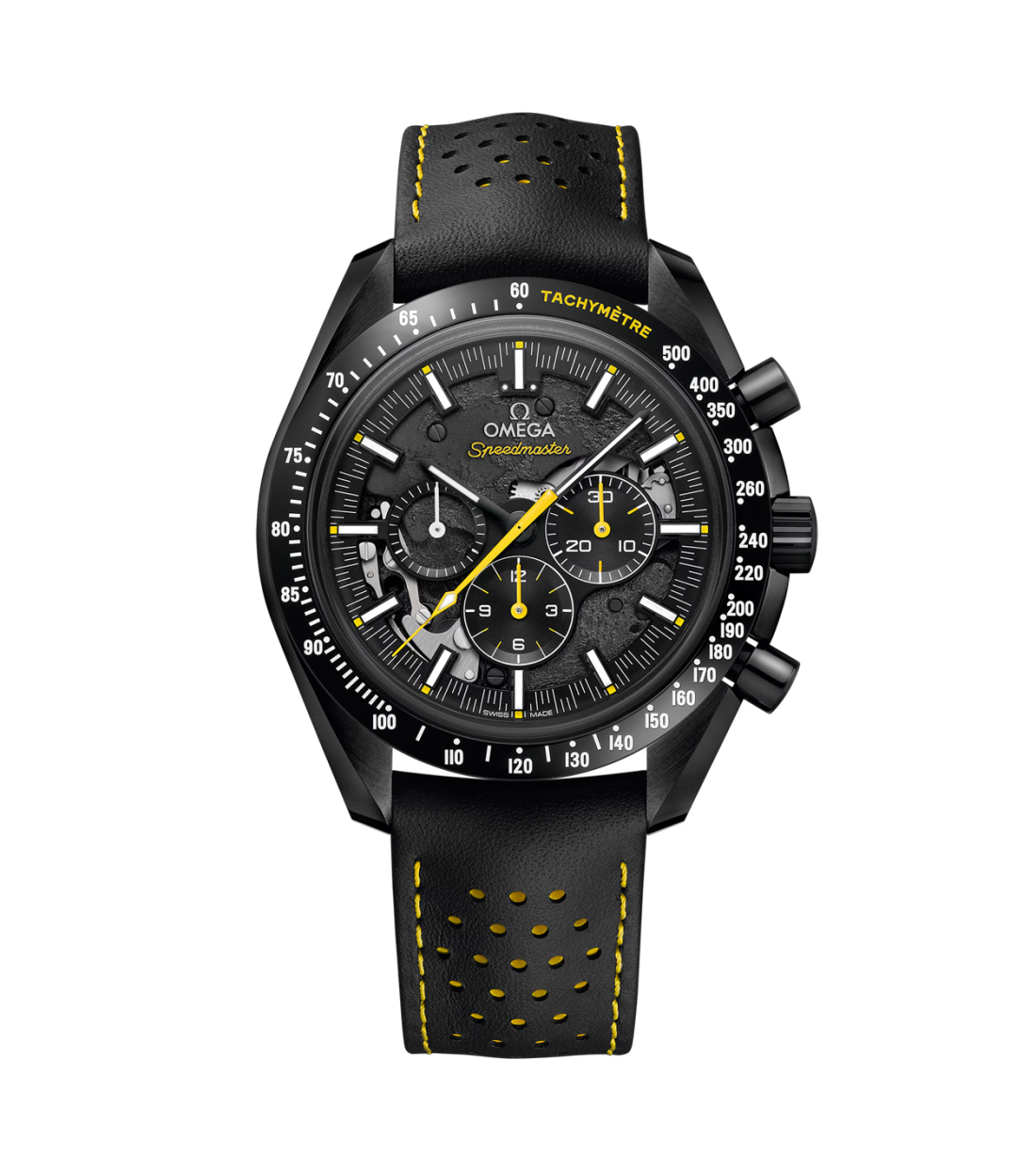 Presentado con una pulsera de piel negra, perforada y con interior de caucho amarillo, todo el reloj es de cerámica negra e incluye agujas de cronógrafo amarillas barnizadas y una escala Super-LumiNova de taquímetro.